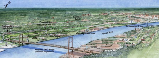 THE NEW DETROIT River crossing would be a traditional suspension bridge, according to this rendering.