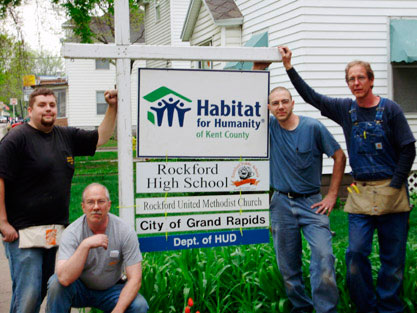 HELPING HANDS at a Habitat for Humanity house in Grand Rapids included a handful of IBEW Local 275 members. They include (l-r) Geoffrey Yonkers, John Nowakowski, Dennis Axdorff, and Kevin Fritz. John and Dennis were honored by Local 275 last month with a “Pat Kramer Award” for their volunteer efforts.