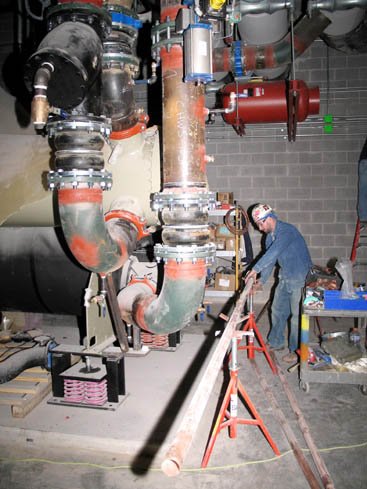 CUTTING A 2-INCH chilled water line at the Van Andel Institute is Chad Abram of UA Local 174, working for Andy J. Egan.