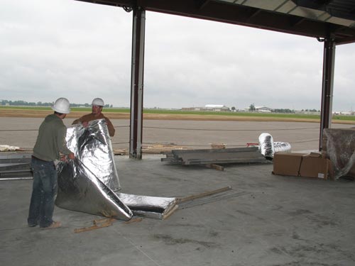 UNWRAPPING SOME DUCT wrapping insulation at the new MBS Airport Terminal project are Adam Fisher and Dennis Heller of Heat and Frost Insulators Local 47, working for Ticon.