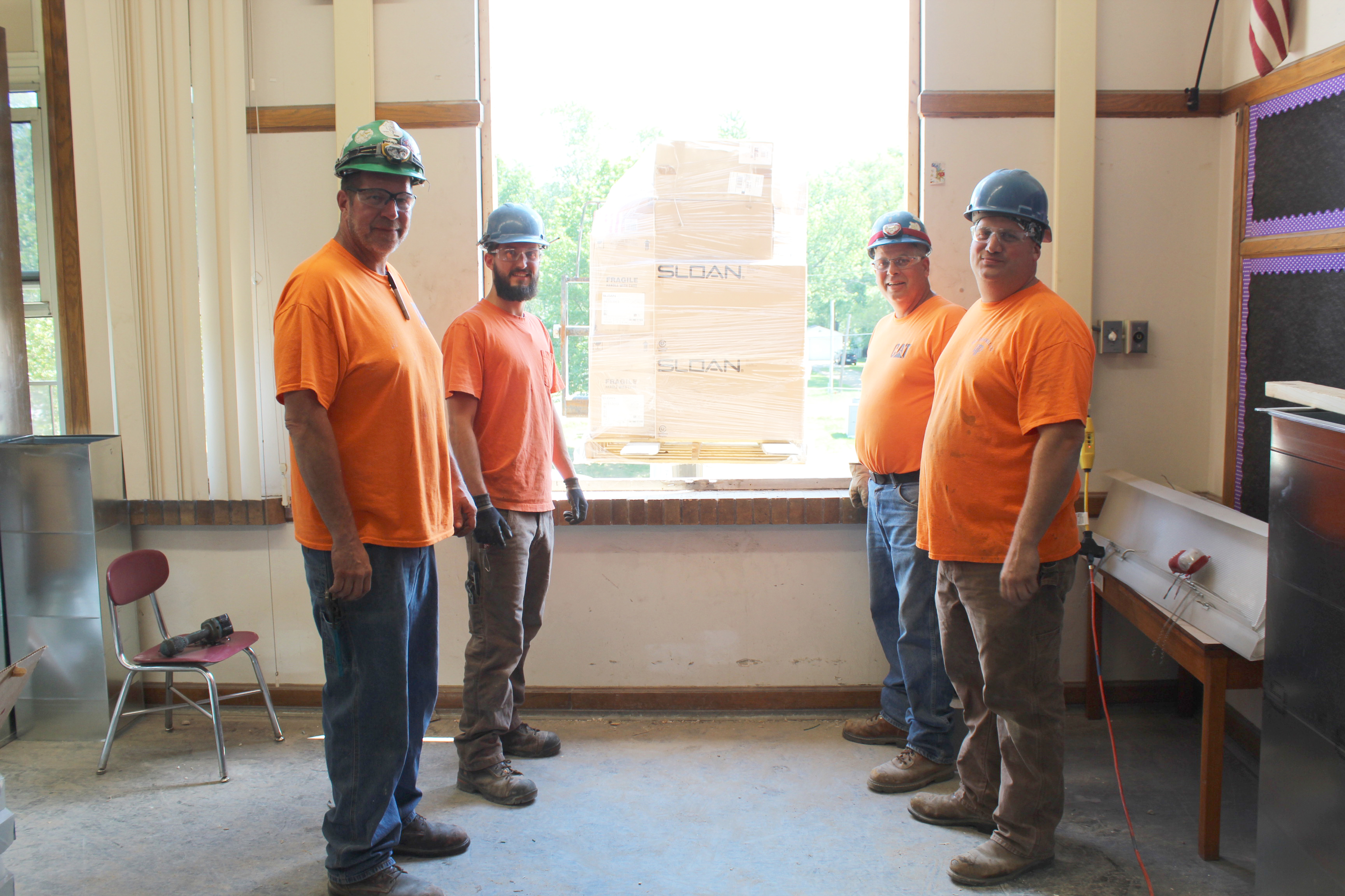 WE ASKED THIS GROUP of Plumbers and Pipe Fitters Local 333 members to have their photo taken while waiting for materials coming in from a forklift in a second-floor classroom window at Prarieview Elementary in Battle Creek. They include: Thomas Draffen, Jordan Grove, Dale Barr and Ben Murphy. They’re employed by Hunter Prell.