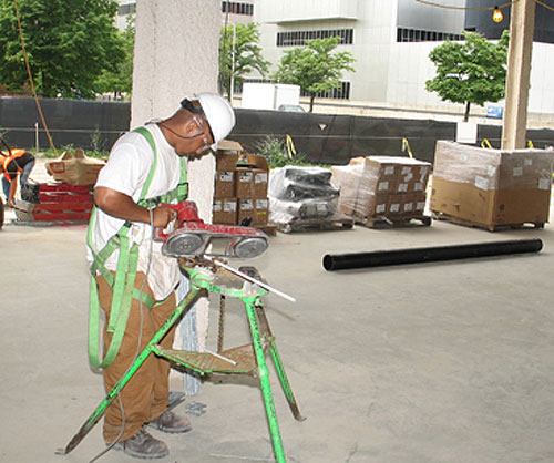 CUTTING A PIPE HANGER at the new Children’s Hospital Specialty Center is Leon Carter of Plumbers Local 98, working for Guideline.